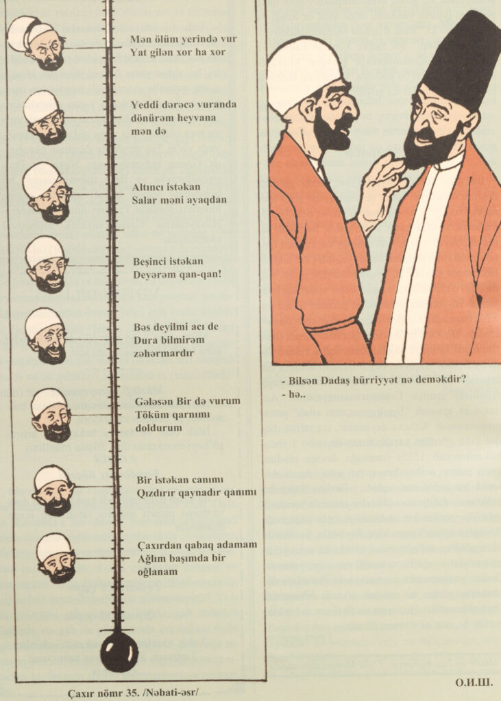On left portion of the image, there is a thermometer with several versions of the same small face, each illustrating one of the the eight degrees or states described by facing text. On the right portion of the image, two men engage in discussion. The man on the left is the face depicted on the thermometer.