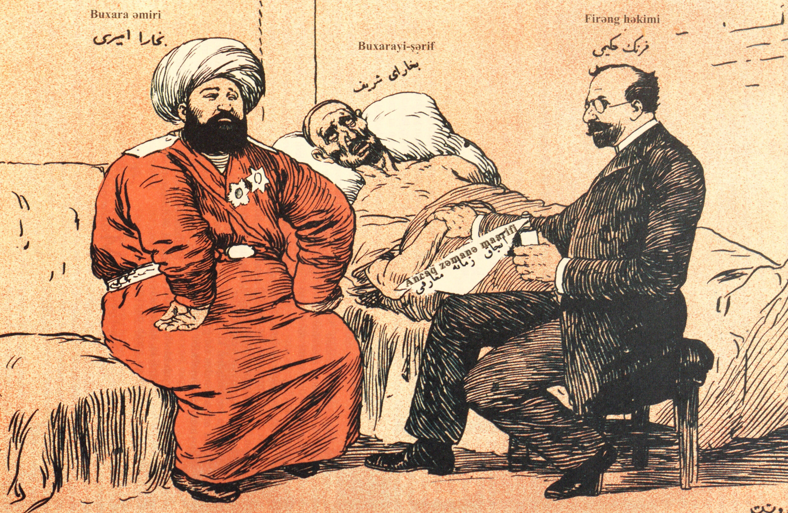 A Foreign Doctor in Bukhara Post navigation Previous ItemNext Item Title A Foreign Doctor in Bukhara Description The Emir of Bukhara and a Western doctor sit at the bedside of a gaunt man. The Western doctor holds a bottle of medicine in his hand. Collection 1911 Publication Reference No. 20 (1911) Middle page