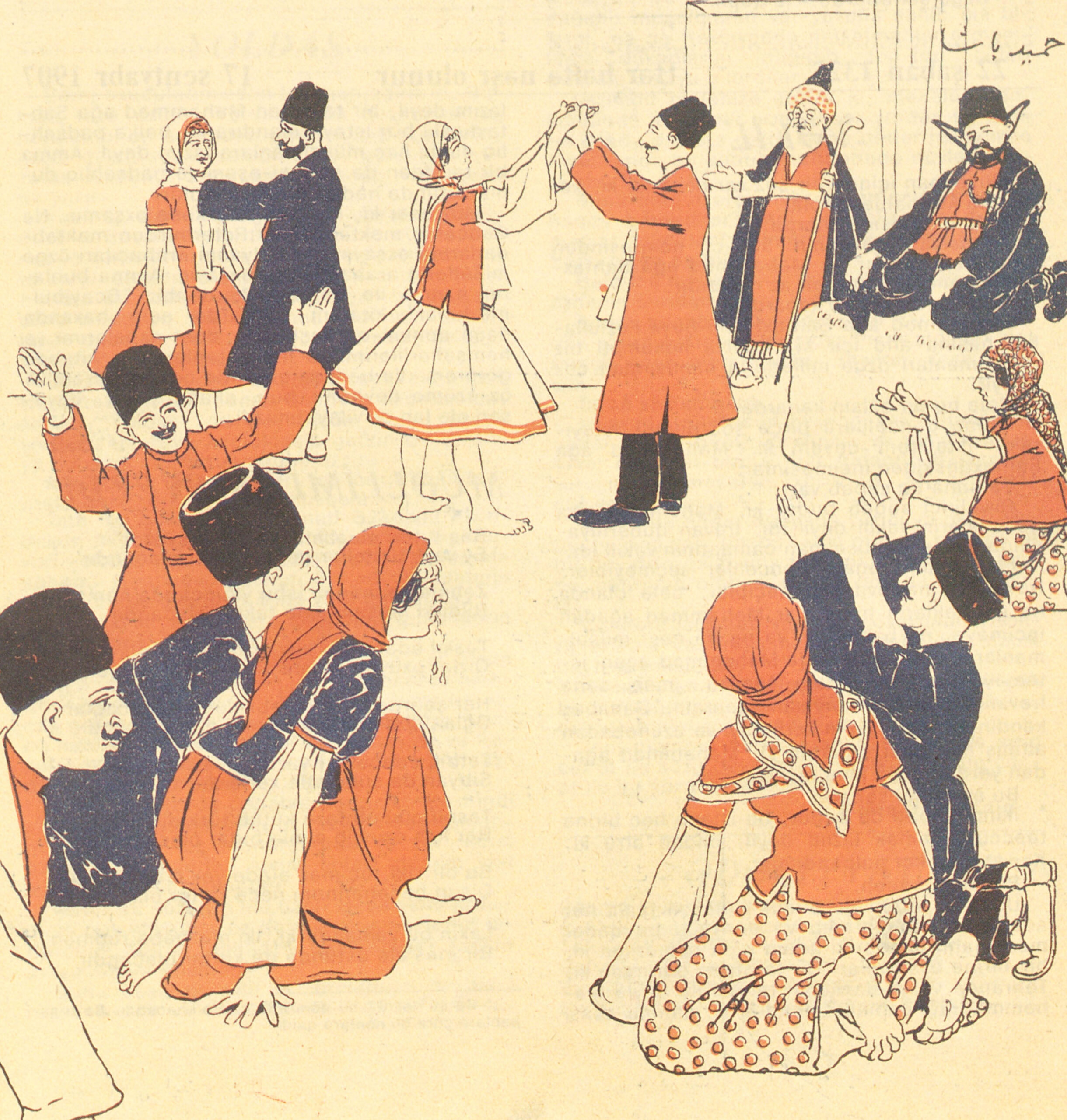 A Sufi leader with donkey ears kneels on a raised platform in a room. Molla Nasreddin stands at the door and points. A man and woman appear to dance while another man grasps a woman by the shoulders. Several men and women kneel on the ground, raising their hands upward.