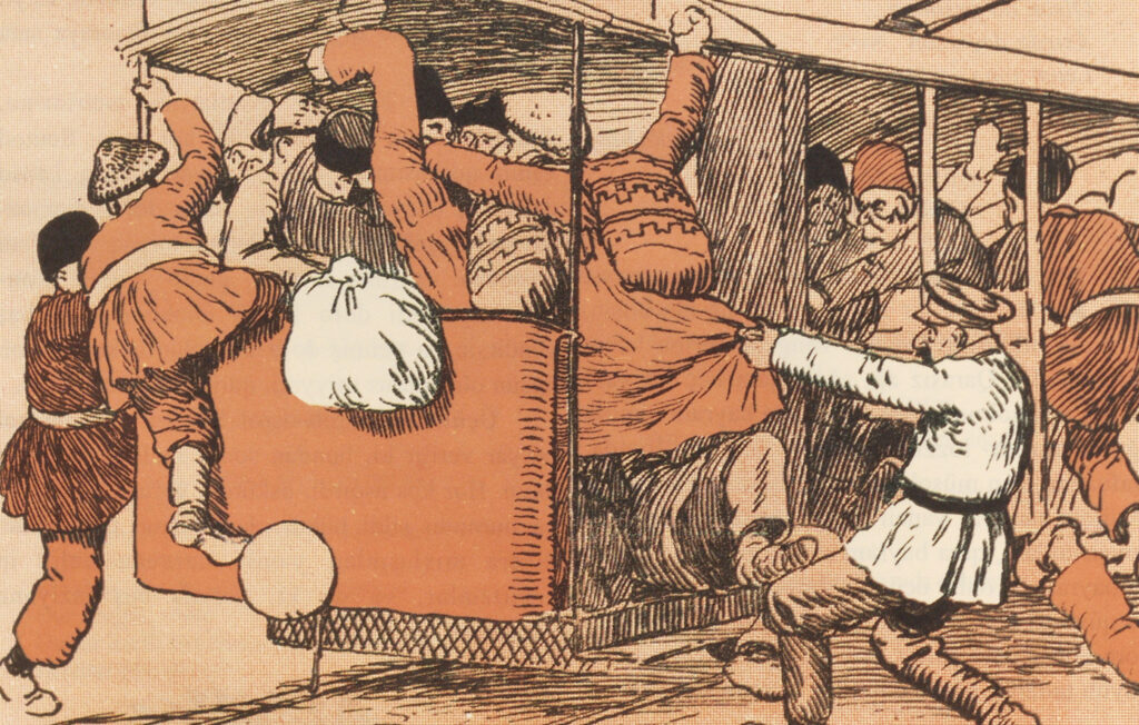A group of men crowd aboard a streetcar, some hanging off the rear of the car while holding poles. A police officer on the street attempts to pull one man off the streetcar by tugging on the man’s robe.