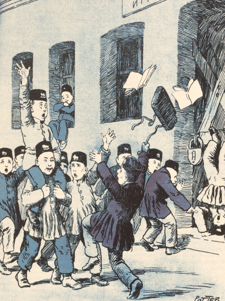Schoolboys parade down the the street, throwing books in the air and shouting. One boy does a headstand along the side of the road, in front of a padlocked door, while two boys watch watch in shock. Another boy sits smugly on the sill of a window, near the locked door.