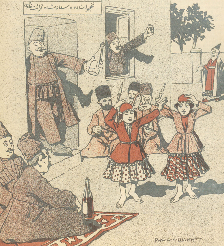 Two men sit on a carpet in a courtyard with a bottle of wine. Two more men look into the courtyard through the door and window of a building. Two dancing children perform while several seated musicians play music. Molla Nasreddin watches from the background and points.