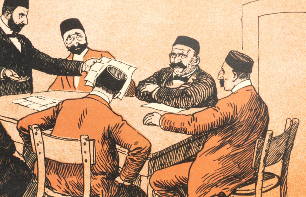 Four men sit around a table on chairs while a fifth man stands, brandishing a piece of paper and addressing the seated men. The seated men have concerned looks on their faces.