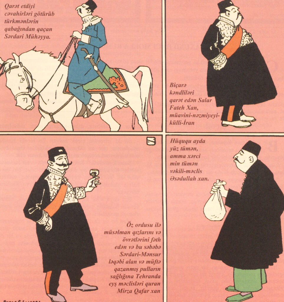 [Top left] Man on a horse with a sword; [top right] Heavy Iranian man with a sash; [lower left] Iranian man with a sash holding a drink ; [lower right] Armanian merchant holds a bag of money