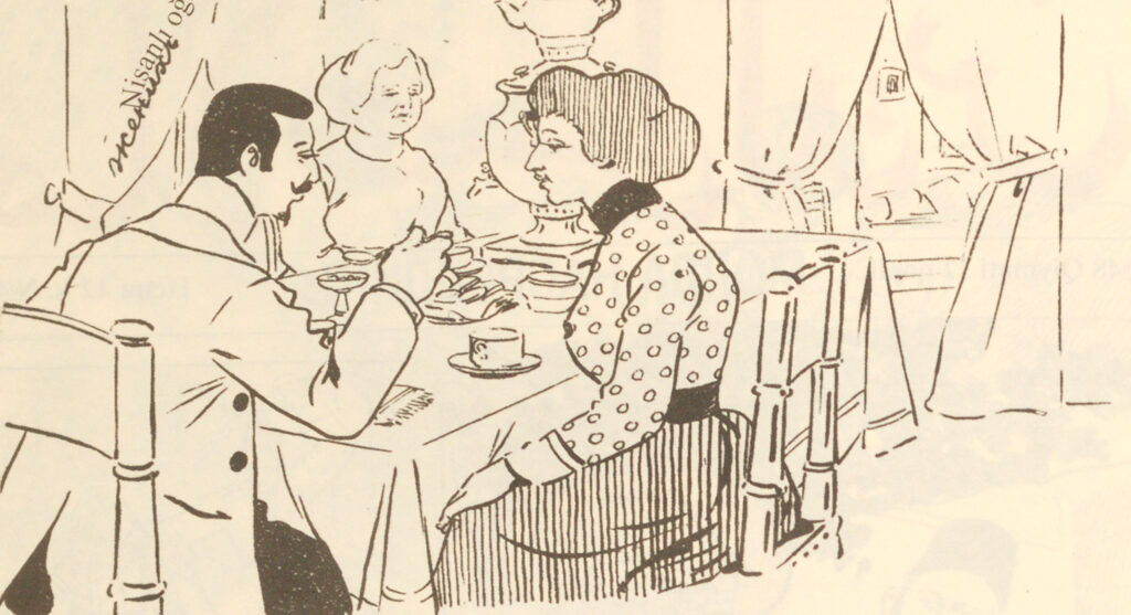 Modern Courtship Post navigation Previous ItemNext Item Title Modern Courtship Description Modern courting: 1 man sits at a dinner table near 1 woman in the home of 1 older woman who sits across the table from them Collection 1909 Publication Reference No. 48 (1909) Middle pages Subjects AzerbaijanCourtship