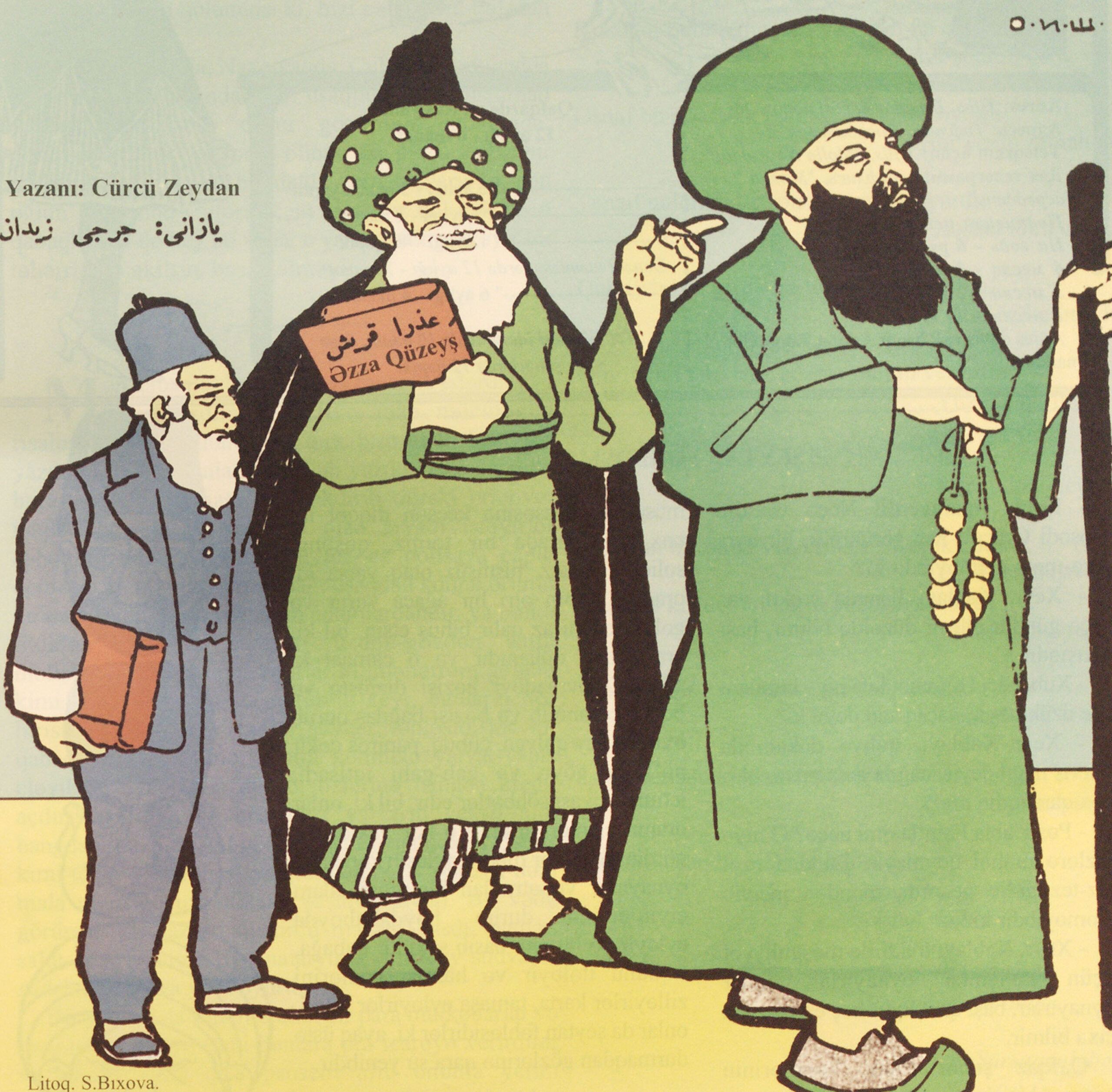 Molla Nasreddin stands between the Lebanese historical novelist Jurji Zeydan and a molla, who stands with his back toward the other two. Zeydan is smaller than the other two men.