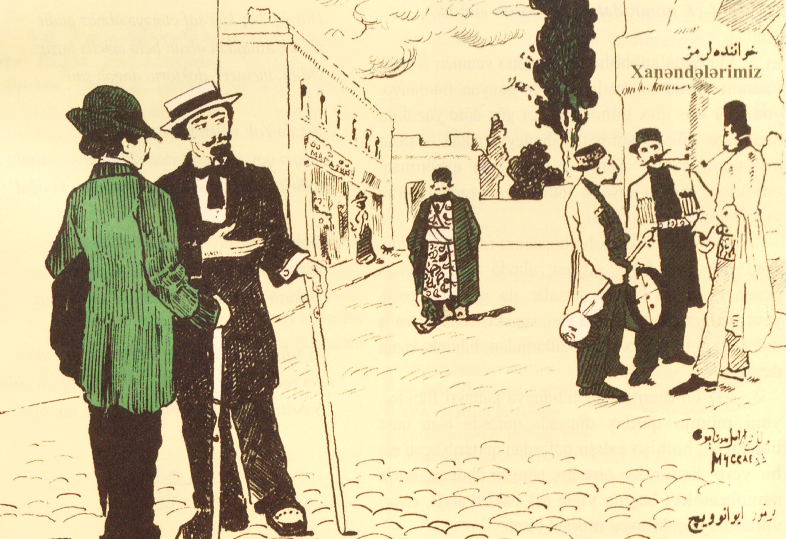 Two Western dressed men look at a group of traditional musicians.