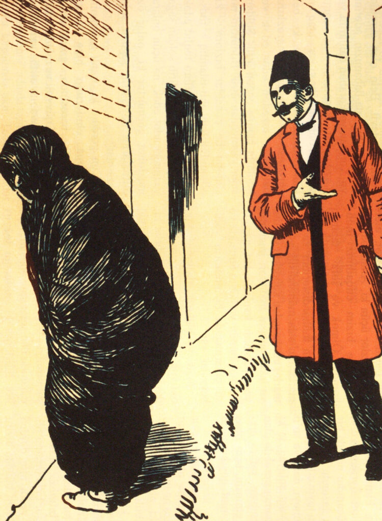 A man in a long red coat pauses while walking along the street to look upon a woman clad in a black robe, who is standing on the side of the road with her back facing him.