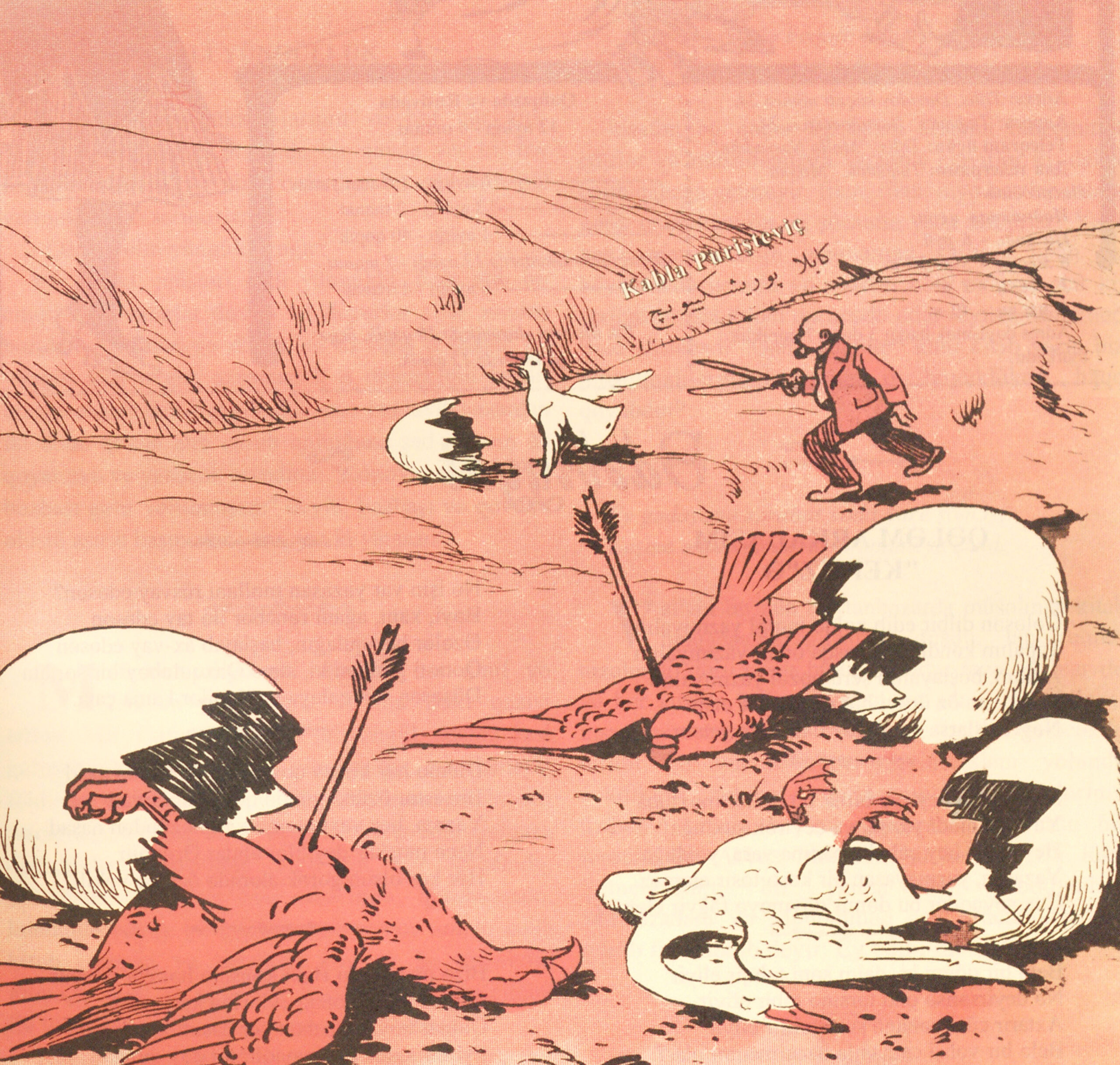 On a field with hillocks, two hawks have been shot down by arrow near a dead goose. Several cracked eggs lie on the ground. A man chases a live goose with a scissors.
