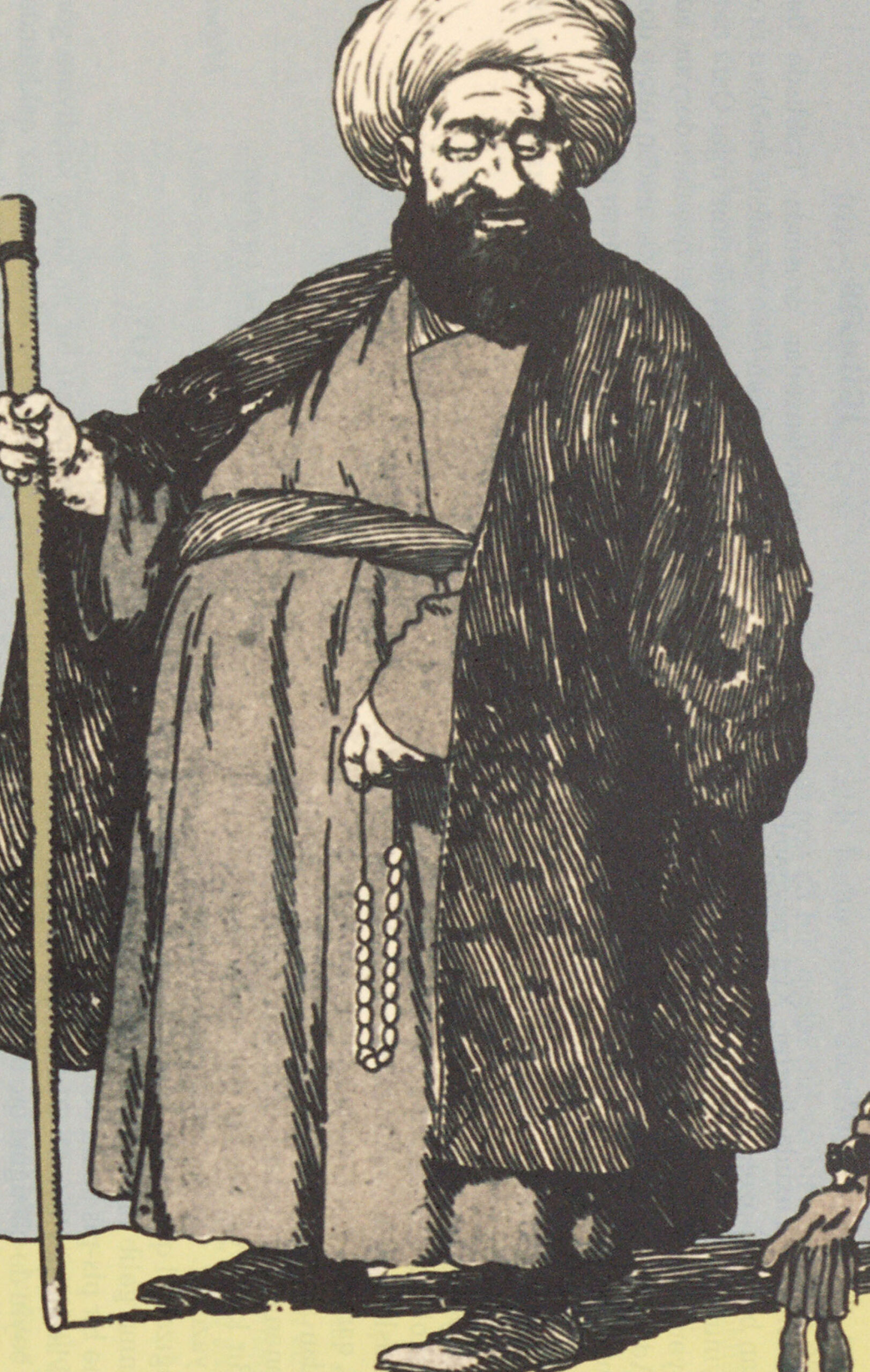 1 large molla stands with a staff and prayer beads looking down at a tiny man who is talking.