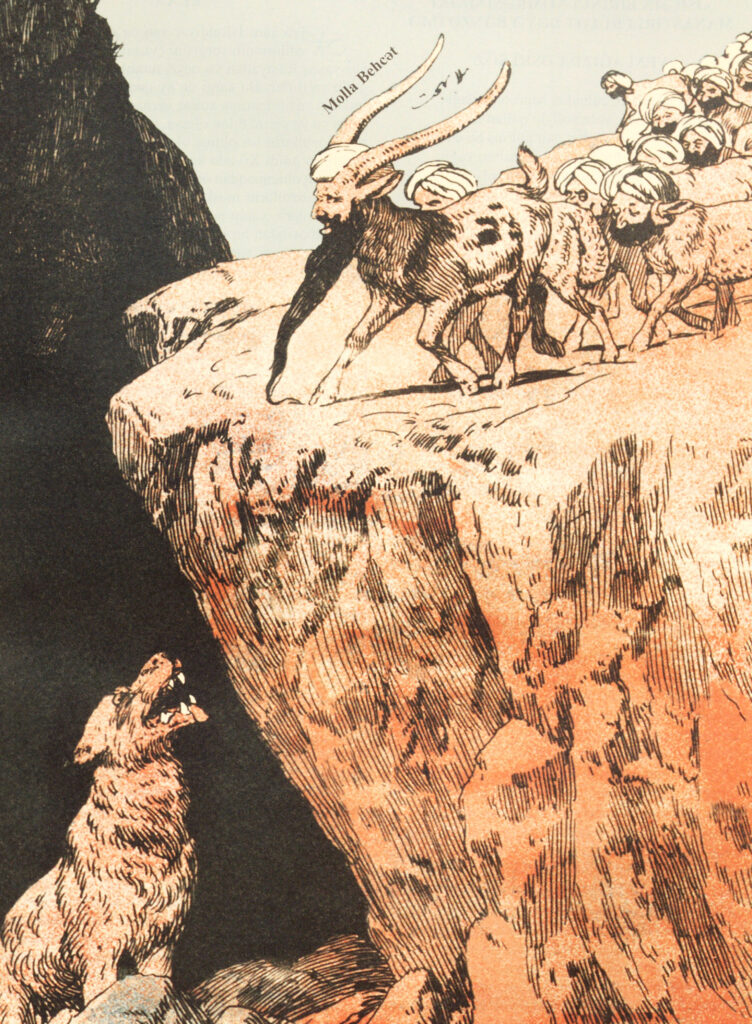 A flock of figures with the bodies of sheep and the faces of men walk toward the edge of a cliff. They are led by a molla-sheep with a long beard and horns. A wolf waits with anticipation at the base of the cliff.