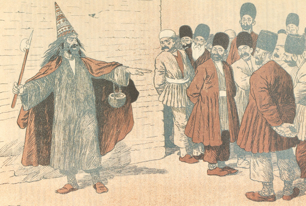 The Macedonian Problem Post navigation Previous ItemNext Item Title The Macedonian Problem Description A man with a pointed cap brandishes an axe and alms bowl and stands in front of a crowd of men, who keep their distance. Collection 1908 Publication Reference No. 15 (April 13, 1908). Middle pages. Subjects MagiciansPoliitics and government