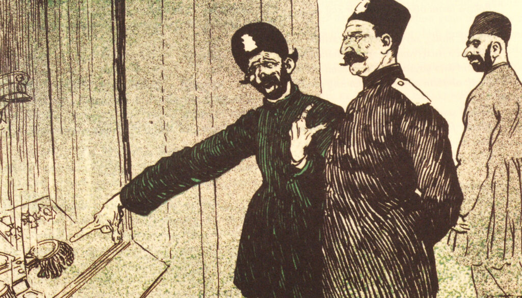 Two Persian officials look at regalia on display while a man watches and listens to them talk.