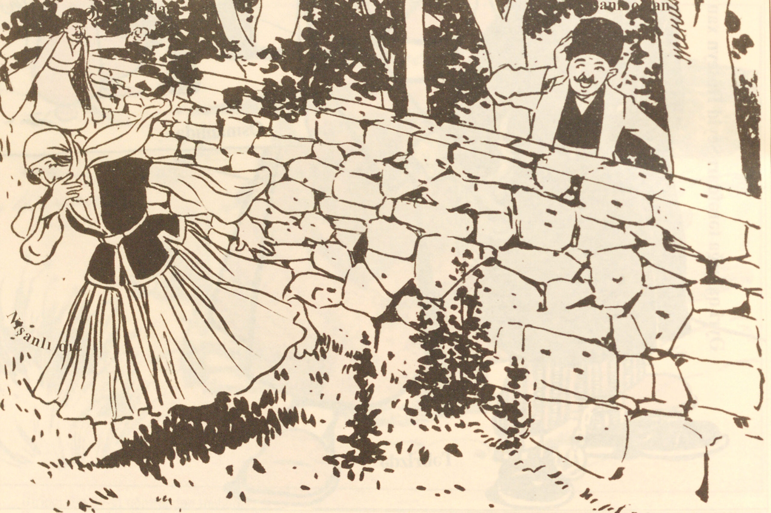 traditional courting: 1 man peers over a wall; 1 woman runs away not wanting to be seen; 1 father chases away a bridegroom trying to look