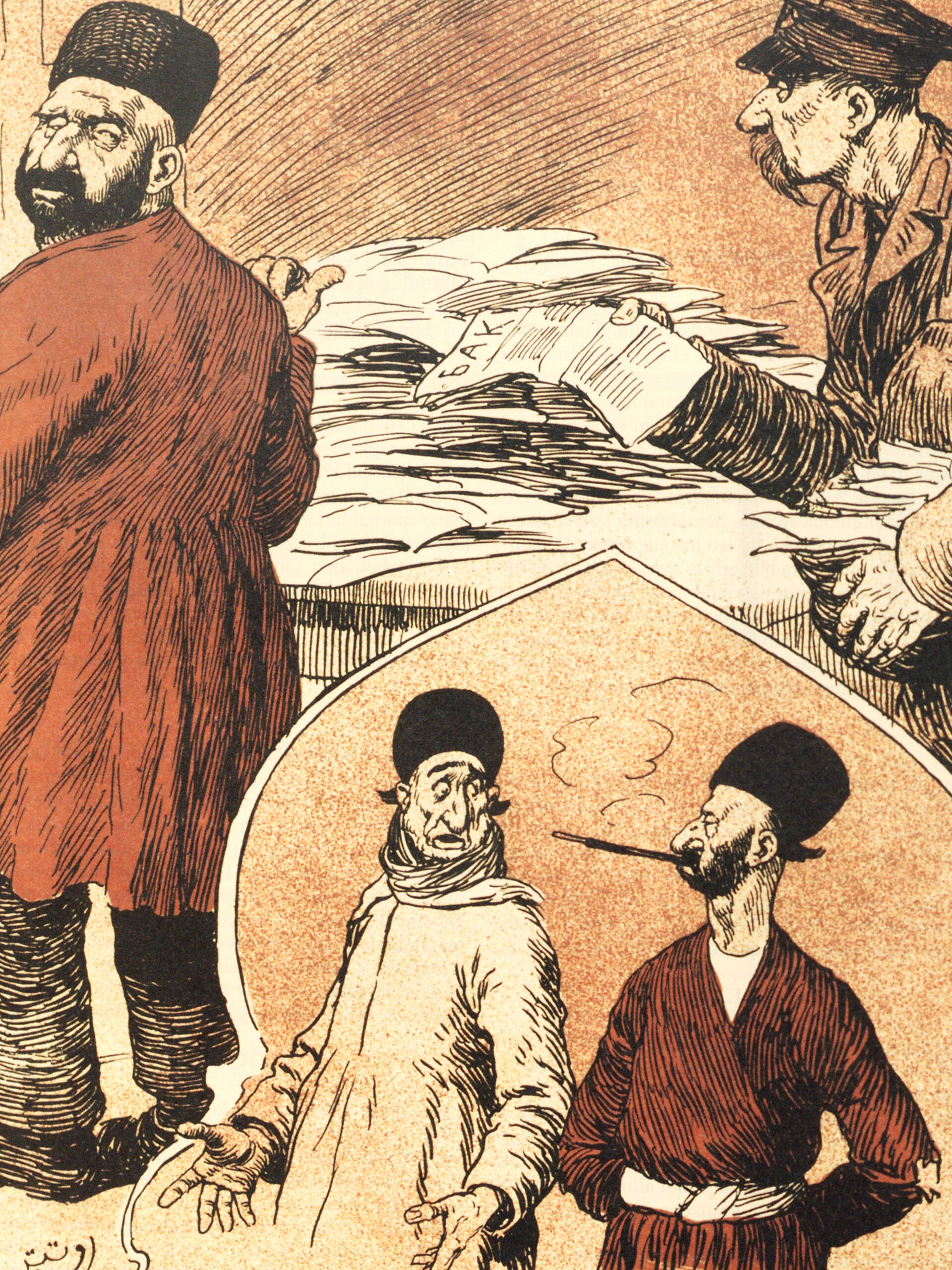 Above, two men stand in front of a table heaped with papers. One glances over his shoulder and points to the stack of paper while another carries a basket of paper and offers one to the other man. In an inset image, two men walk together. One smokes a cigarette and the other looks at him with a concerned expression.