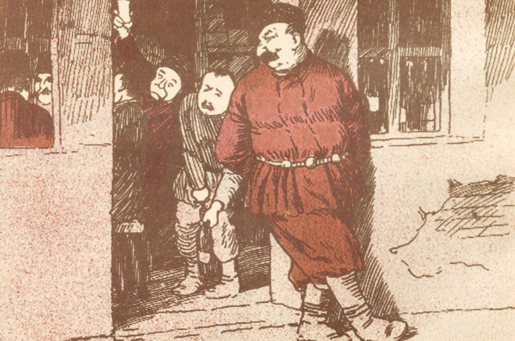 A man stands outside on the street at a doorway. Several men are visible inside the building through the open door and one man strains to open a bottle using a corkscrew.